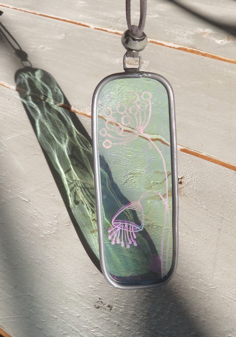De gravure op de hanger is met de hand aangebracht op het glas.