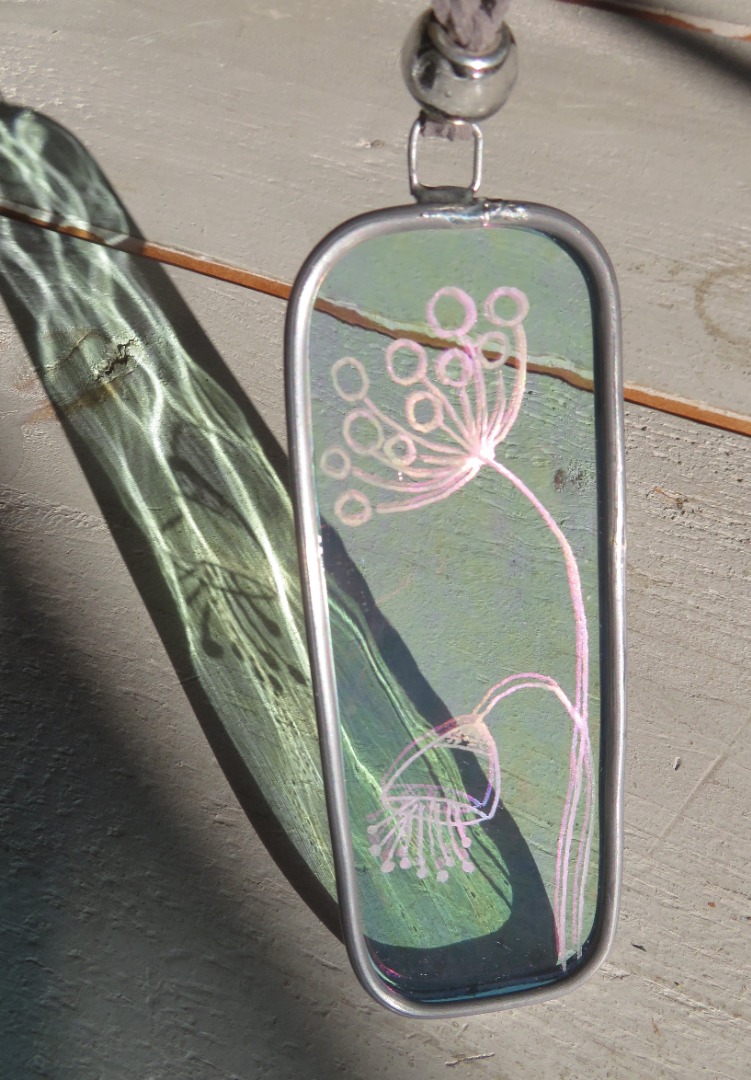 Het glas is omvat met een loodrand en heeft een oogje met daarboven een glazen kraal.