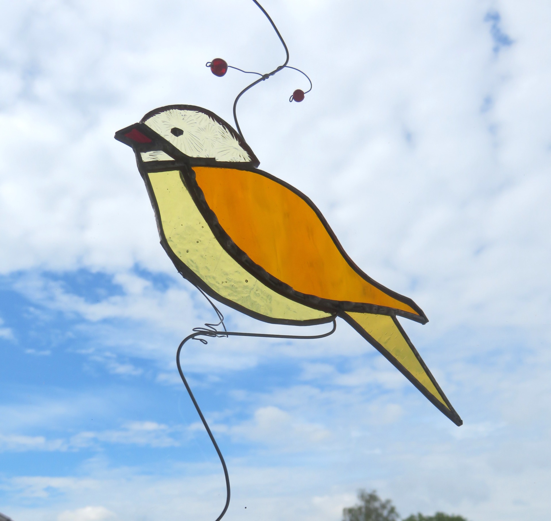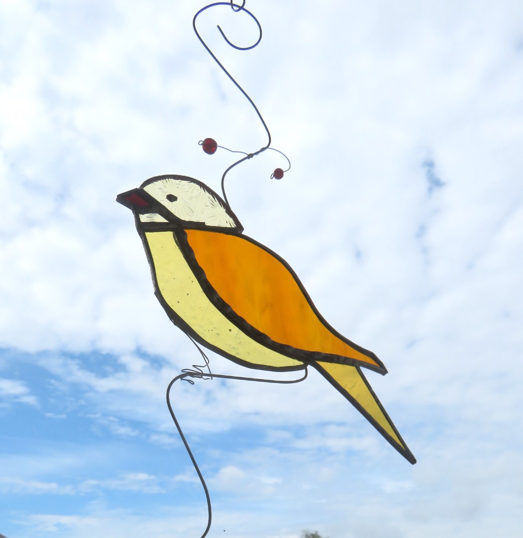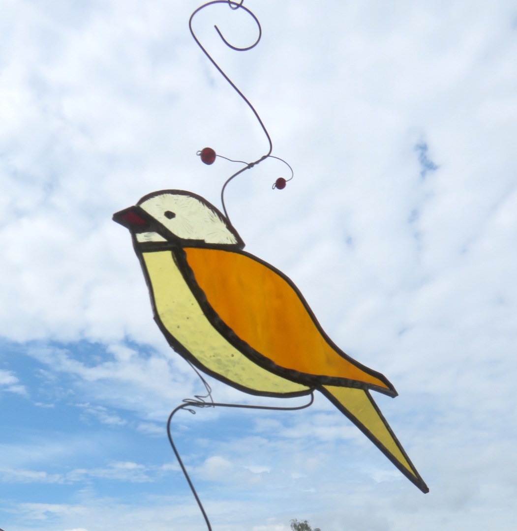 Glazen vogel geel op een tak. Als je dit vogeltje voor de ramen hangt lijkt het haast of hij buiten is. Ook geeft het een mooi effect als de zon er op schijnt .Het vogeltje is gemaakt van verschillende kleuren glas met de tiffany techniek.