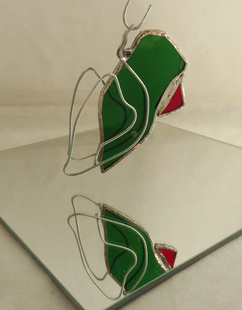 Klein vogeltje glas groen. Als je dit vogeltje voor de ramen hangt lijkt het haast of hij buiten is. Ook geeft het een mooi effect als de zon er op schijnt .Het vogeltje is gemaakt van gekleurd glas met de tiffany techniek.
