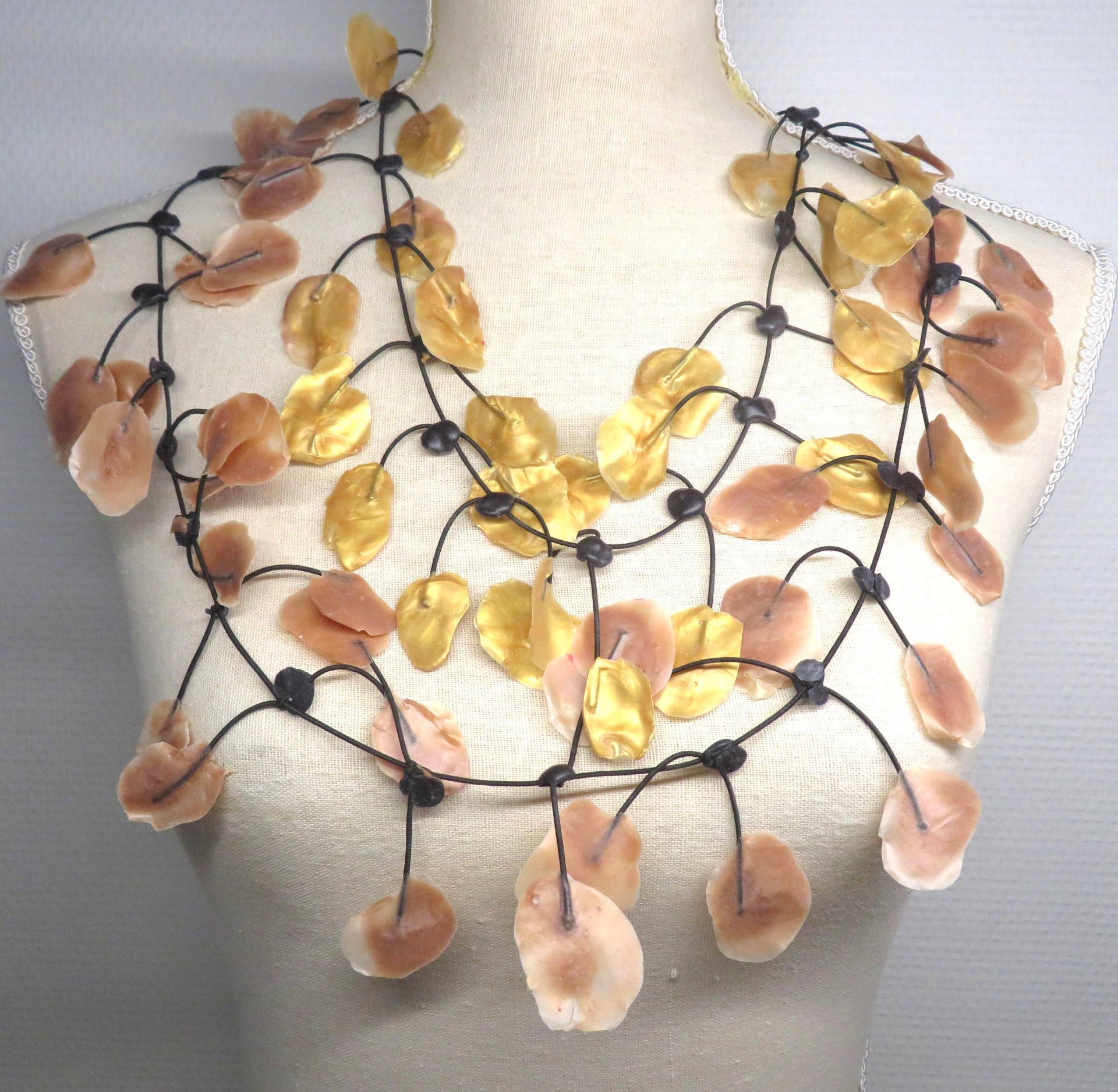 Het is een makkelijk te dragen ketting met lichte blaadjes van rubber. Geeft een mooi effect op een egale bloese jurk.